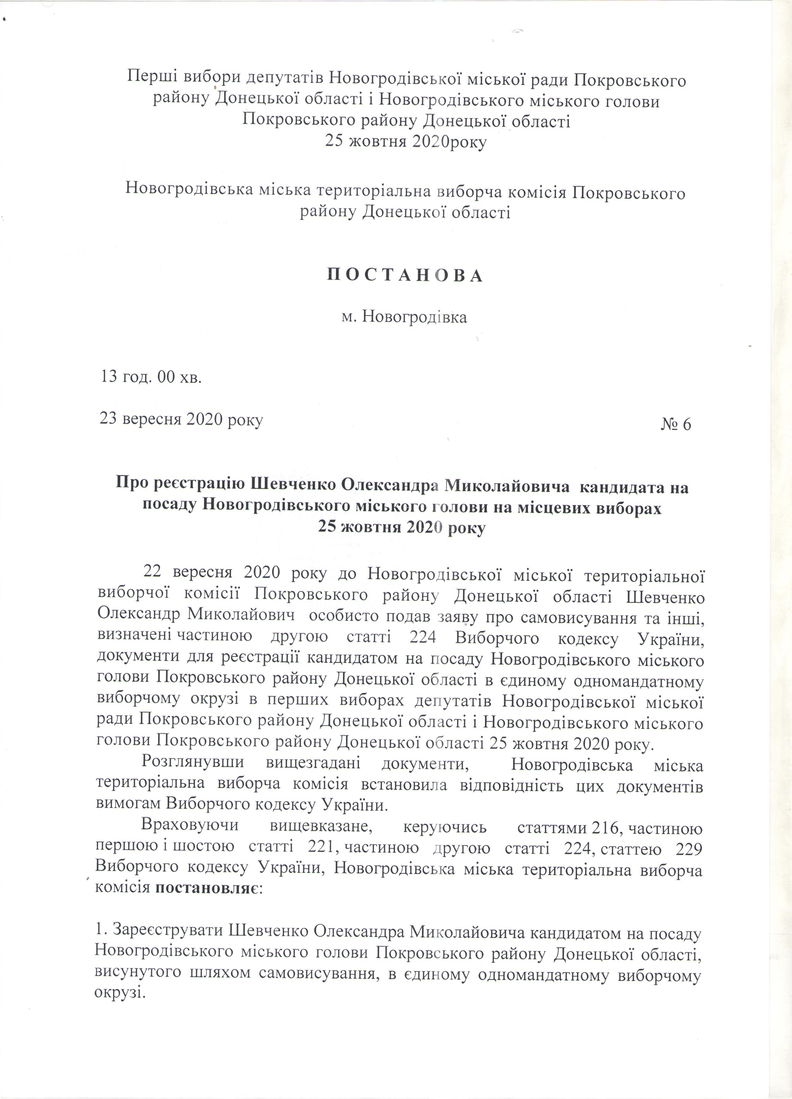 Про реєстрацію Шевченка Олександра Миколайовича кандидата на посаду Новогродівського міського голови на місцевих виборах 25 жовтня 2020 року Постанова № 6 від 23 вересня 2020 року Постанова № 6 аркуш 1 Постанова № 6 аркуш 2 Друк